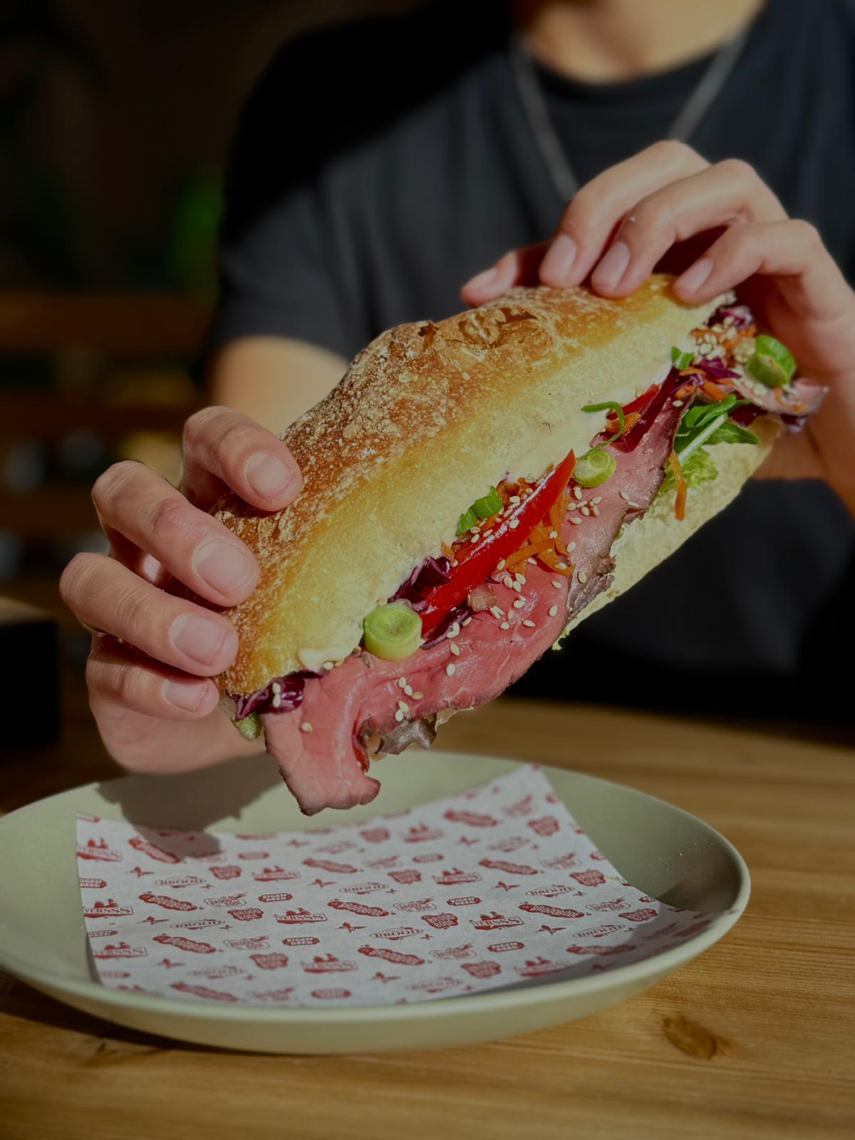 Met huisgemaakte wasabi mayonaise, luxe sla, rosbief, teriyakisaus, bosui en sesamzaadjes.